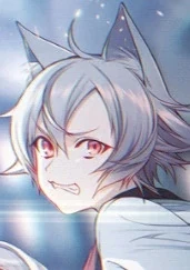 Линия, девушка зверолюд у нее красные глаза а так же белые серебристые волосы есть уши на голове а так же серый хвост одета в школьную форму синий воротник красный галстук рубашка почти расстегнута в районе груди из за ее большого размера